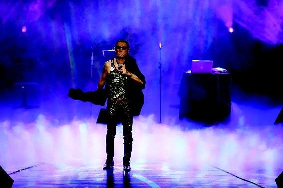 黄安一登场就把整个舞台由冷色调改成了暖色调:扎起的马尾辫,亮光闪闪的皮裤,一副黑色墨镜,显得火爆十足,用他自己的话形容“今天打扮的像谢霆锋的爸爸”。