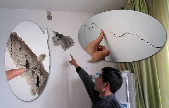 记者说,看到有住户家中的裂纹已经穿透了墙体。杨经理说,这种裂纹只影响美观,而不会影响房屋使用功能。对于有居民家中一下雨就会渗水的问题,杨经理说这只是施工时防水没做好,是一种质量通病。