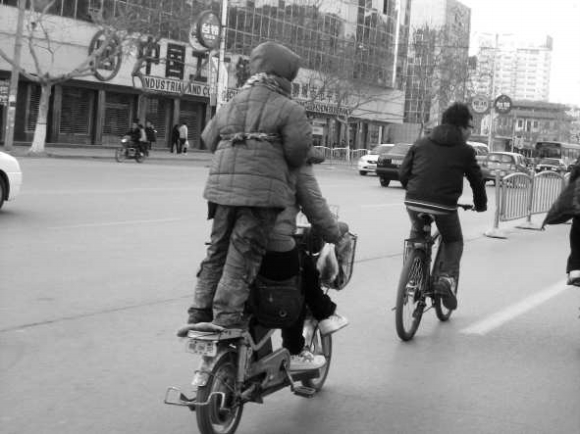 15日下午17时左右,在柳园南路,一位市民翘着二郎腿骑电动车,孩子站在车后座上。如此险象环生的“车技”,让大家为他们捏了一把汗。 本报见习记者 赵寰 摄