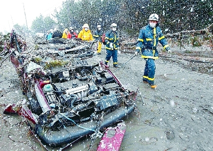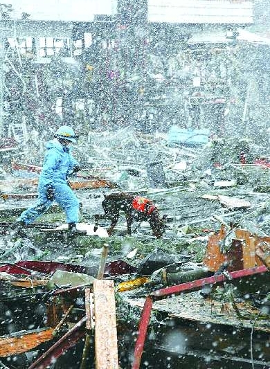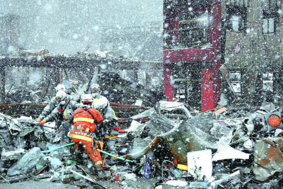▲仙台降下大雪,救援人员在被摧毁的一处工业区内工作。
