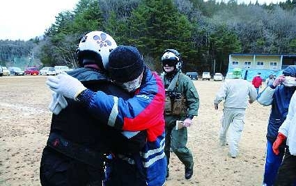 岩手大船渡,一位日本居民拥抱运送救援物资的美国士兵。