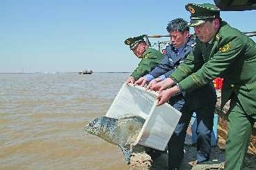 图为红光办事处、红光边防派出所和市渔政处的工作人员送海豹回家。