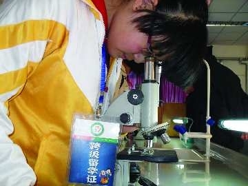 下午,这30名小学生又被带进初中化学及生物实验室,“摆弄”起各种各样的实验仪器。他们首先学习了显微镜的基本使用与操作,然后使用显微镜来观察人体血液细胞标本。之后这些小学生们又在化学实验室亲自动手做起酚酞与碱性物质相互作用的化学实验。