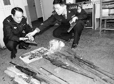 15日,邹城市公安局民警在清理收缴的非法枪支。为严厉打击各类涉枪违法犯罪活动,该局在全市范围内开展了为期两个月的集中清查收缴非法枪支专项行动。截至目前,已收缴非法枪支21把,其中猎枪6把,气枪11把,仿真枪4把。