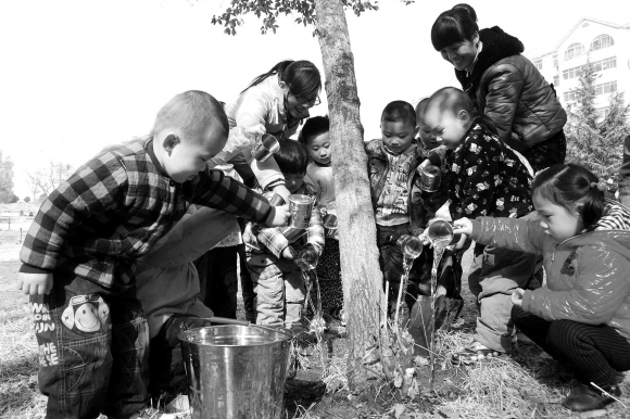 15日,财源街道中心幼儿园举办以“呵护绿色、扮靓家园”为主题的认养小树活动。当天,小朋友们给认养的20余棵小树浇水。本报记者 刘丽 摄