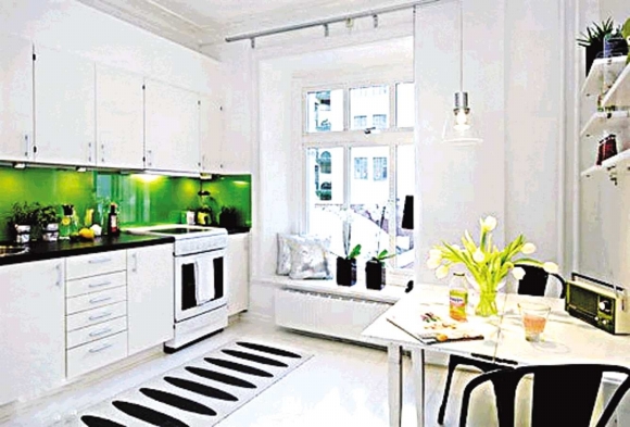 色彩是最美丽的语言,在一个空间里巧妙用色即能显出别样风情。在这个以白色为底的厨房中,如果只加黑色就稍显呆板,因此特别打造一条亮绿色的烤漆板以及小绿植物,空间顿时生机勃勃。