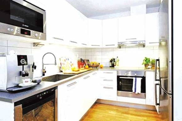 这个厨房装饰设计元素较少,但非常实用。储物空间多且几乎所有厨房家电一应俱全。为了使空间不显拥堵,整个厨房都用直线条构造,展现出简洁干练的气质,而橱柜材质则是带反光的白色板材,显得时尚的同时也扩大空间视觉效果。