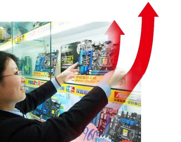 16日,在潍坊科技市场,工作人员正在整理货架上的电脑主板。据销售人员介绍,因为电脑主板的一些零部件是日本生产,受日本地震影响,一些电子产品的价格开始小幅上升,高端产品价格上涨尤其突出,例如主板价格就有十几元的涨幅。但估计这种情况不会持续很长时间。