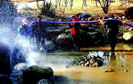 16日,在人民公园,工作人员正在给东侧的人工湖进行清淤冲刷。据介绍,为了迎接游园旺季的到来,尽早为人工湖更换清水,公园管理部门专门增添人员,确保清淤工作提前完成。