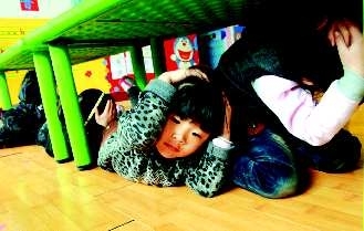 16日,在潍坊奎文外国语幼儿园,小朋友正在进行地震避险演练。为了普及防震知识,增强孩子的防震减灾意识,提高孩子应对突发地震灾害时的能力,幼儿园组织孩子和老师进行了地震避险演练。
