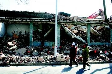 16日,在潍坊市道口北路,行人正从拆迁的房屋边走过。正在拆除的房子紧挨着马路,拆除的房屋边上也没有围挡防护,只是扯了一串小旗子在路边,行人就从摇摇欲坠的房子边上走过,让人捏一把冷汗。 本报记者 孙国祥 摄影报道
