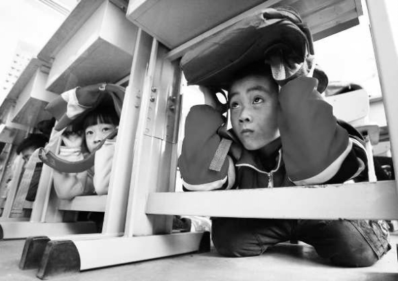 17日,开发区实验小学开展地震应急逃生演练,教学生在危险中逃生、自救、互救的基本知识。二年级二班的学生练习头顶书包躲在书桌下躲避。 本报记者 李军 摄