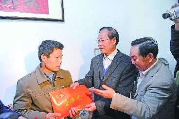 17日上午,省见义勇为基金会理事长孟庆丰(中),省政法委巡视员、省见义勇为基金会副理事长窦广平等省市领导,前往章丘市黄河乡王圈村看望并慰问勇救五名落水女孩的王其吉,同时授予他“山东省见义勇为先进分子”荣誉称号。