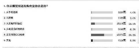 凤凰网也针对“你认为出现抢购食盐风潮的主要原因”进行调查,80737名网友参与了调查。其中,“亲友间的口口相传”的人数占到了60.5%,“从其他网络途径”的人数占到了18.5%。