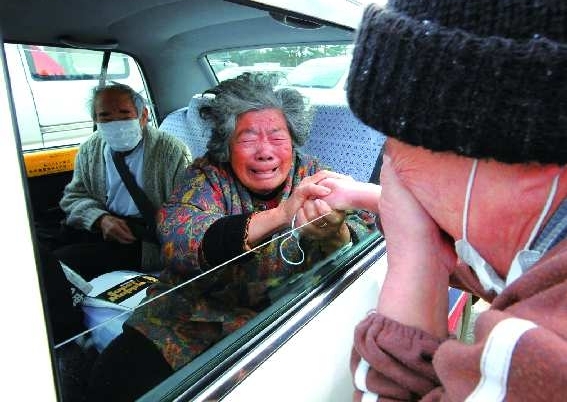 17日,岩手县陆前高田,一对老夫妇和亲友作别,带着儿子去北海道避难。 东方IC供图