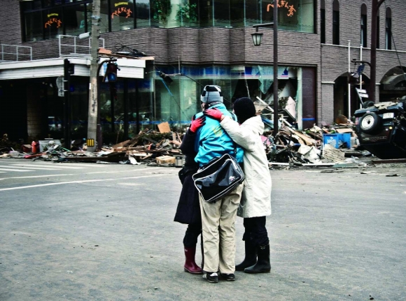 日本釜石,朋友在地震后的街头相见,三个人紧紧拥抱在一起。在大地震中,位于岩手县釜石港的世界第一防波堤未能抵抗住海啸,导致釜石市整个市区被海水吞没。 东方IC供图