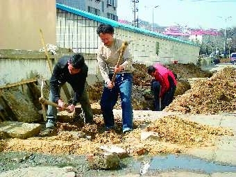 17日上午,困扰了居民一个多月的污水路终于迎来“治病人”。记者在市区和平路125号楼前的现场看到,5位工人正在掘开流污的下水道路段,准备更换老化的下水道(如图)。“一天就能修好,居民可以正常行走了。”一位工人告诉记者。