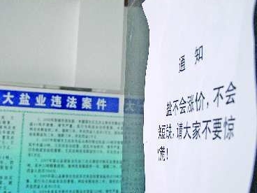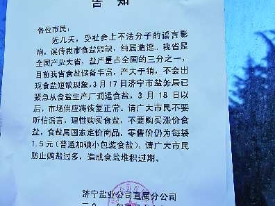 “山东作为产盐大省,食盐不会出现短缺现象,目前我们已经紧急派出业务人员赶赴定点盐场,协调督促食盐调拨,18日以后,市场供应将恢复正常。”针对目前的市民抢购食盐的现象,济宁市盐务局于局长表示,目前已经联系公安、工商、物价等部门召开紧急会议,对于市场上的食盐将敞开供应,满足市场食盐需求。