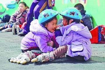 “全副武装”,在轮滑教练的带领下玩得不亦乐乎。中途