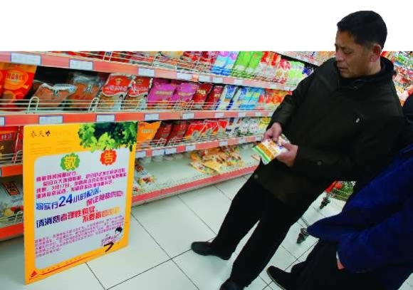 20日,在东三路某超市食盐专柜前,一些市民无奈地看着商场的告示。由于之前不少市民跟风购买食盐多达四五箱,一些消费者专门来超市询问能否退货。 本报记者 郑美芹 摄