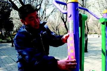 董志强是十名管理维护人员之一,它主要负责东苑公园片区。董志强介绍说,滚筒钢条缺失这明显是人为原因造成的,设备都是刚刚安装的,不可能自己就断掉;螺丝的丢失也是一些人偷着卸下来拿回去用了,在他的印象中已经丢失了六颗螺丝了;而像一些转盘之类的器材,年轻人往往不按正常规则操作,用猛力旋转,如此则很容易造成轴承的脱落或损坏;更有一些小青年甚至会爬到器材上荡秋千,容易引起立桩的松动或扭曲。