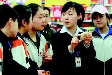 20日,在潍坊市福寿街佳乐家,学生正在了解有关商品真伪辨别的方法。当日,潍坊五中联合潍城工商分局,在超市中给学生上了一堂消费维权知识课,让学生更直接地了解辨别商品真伪、消费维权的相关知识。