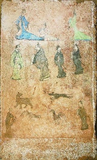 壁画绘制在白色地之上,石材加工平整,因此只是在表面涂抹白地,直接在白地上绘制的。除了人物形象,壁画中还有鸡、狗等动物的形象,富于生活气息。壁画内容包括敬献、谒见、斗鸡、宴饮、舞蹈等场面。其中尤以绘制于门楣内侧的12个人物形象神态各异,眉须飘然,栩栩如生,描绘出汉代的武士形象,摆放在门口,也是护卫墓主人、避免打扰的目的。