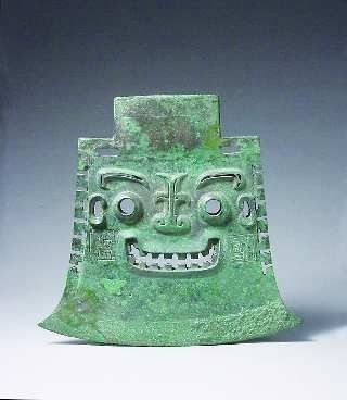 “亚丑”钺,商代,1965年出土于山东青州苏埠屯,通长32.7厘米,刃宽34.5厘米,长方形,方内,双穿,两肩有棱,弧形刃,器身作透雕人面纹,极富威严。钺正反两面铭“亚丑”二字,故得此名。