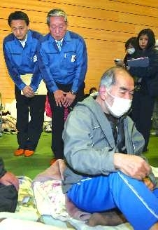 22日下午,东京电力公司副社长鼓纪男(后排左二)前往福岛县田村综合体育馆避难点,向避难居民鞠躬谢罪。