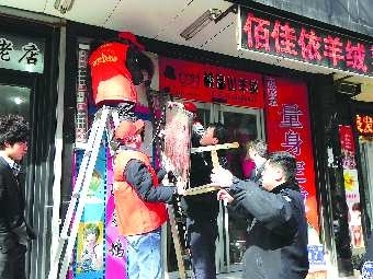 本报3月22日讯(记者 赵伟 通讯员 宋振飞 赵军) 《济南市户外广告设置管理条例》自3月1日正式实施已经有三周时间了,许多市民还不清楚详细的法律规定,依然随意在店铺门前设置电子灯箱、在墙上张贴宣传广告。针对此种情况,22日,百姓城管西市场服务队和槐荫区执法局一起开展了送法上门活动。??22日,槐荫区执法局西市场中队、直属二中队与百姓城管西市场服务队一起,对纬十路临街店铺存在未经批准擅自设置户外广告的经营业户实施送法上门。??执法人员和百姓城管一起向经营业户详细解释了新规中与他们设置电子灯箱行为相关的法规条文,使他们了解自身行为的违章性。许多经营者在听了执法人员的解释后,纷纷自行拆除违章设置的户外广告。对无法自行拆除的,执法中队也与百姓城管一起帮助他们进行了拆除,并将拆除后的物品归还他们。?