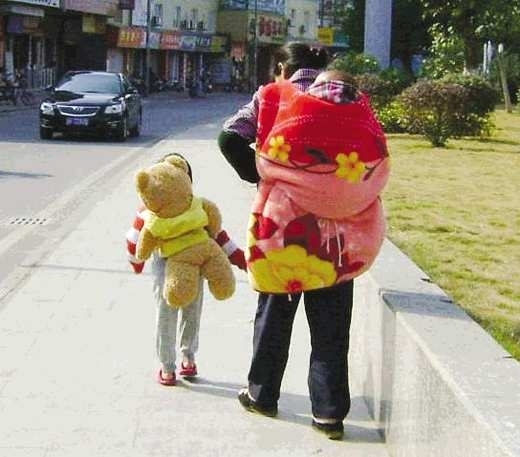 自述:背着玩偶有模有样。