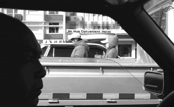 3月20日,在东岳大街与迎胜路路口,两名身穿橘红色上衣、戴着口罩和白色帽子的市民不惧艰险,在车流中发宣传单揽生意,十分。
