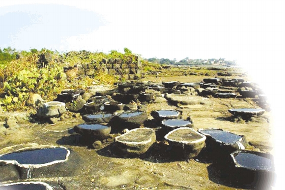 距离海南儋州那大镇大约60公里的地方是洋浦,那里拥有著名的千年古盐田。据说,1200多年前,一群盐工从福建莆田南下渡过琼州海峡,来到了洋浦半岛。他们发现此地高温烈日,便改变“煮海为盐”的传统做法,开创了日晒制盐的办法。至今,仍有上千个石盐槽遍布在海滩,村里尚有30多户盐工,每当夏秋之际,他们便在这片盐田上演习古老的制盐方法———耙泥翻晒,过滤卤水,再放进石槽中,经过一个下午暴晒,就可以收盐了。