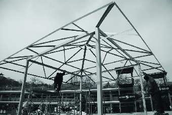 3月22日,在第一海水浴场,工作人员正在沙滩上搭建一处遮阳棚。据了解,临近旅游旺季,来浴场游玩的游客逐渐增多,为给游客提供方便,相关部门在此搭建一个可以为游客的遮阳棚,预计月底就能完工。