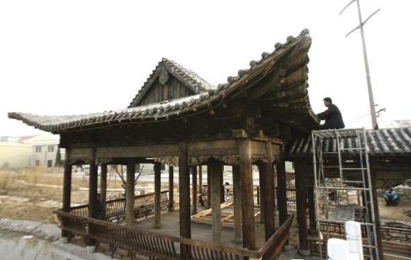 20日,在位于郑州路上的“城市记忆·老村巷”施工现场,工人正在搭建一座仿古水仙亭。据工人介绍,这座亭子的木料全部由山西运来,并依照清代的式样建造。目前,“老村巷”里已有三座院落搭建完成。 本报记者杨宁 摄影报道