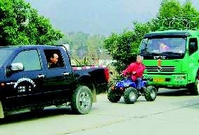 作品描述:一老人开着“小四轮”行驶在车流中,前