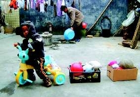 作品描述:一小男孩用塑料筐和纸箱串成一辆“小火车”。