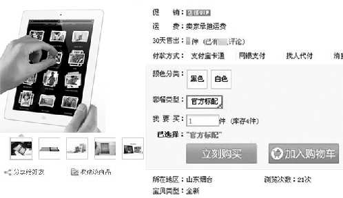 目前,记者在一个烟台卖家的淘宝店面内看到,iPad2(wifi+3G,64G,黑色)报价7350元,淘宝店主告诉记者“库存数量不多,只有4台。”购买时间为3月11日。订金为301元,余款于店主购买后通知支付。iPad2发售后10天左右可以到货,前15位订购的淘友们到货日期大概为3月底4月初。