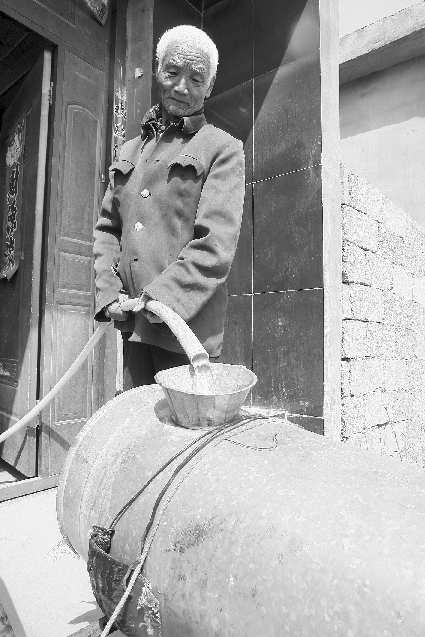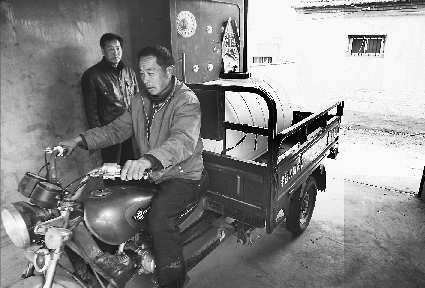 22日下午,56岁的村民刘明华骑着三轮车摩托车到邻村去拉水。每周去邻村拉一次水几乎成了刘明华生活的“大事”。老刘的三轮摩托车上,放着一个塑料大桶,这是他们全家半年来的拉水工具。“这个桶一次能装两立方米左右的水,够全家吃一个星期左右。”刘明华说。