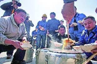 午饭时间,大伙吃起了香喷喷的大锅饭。