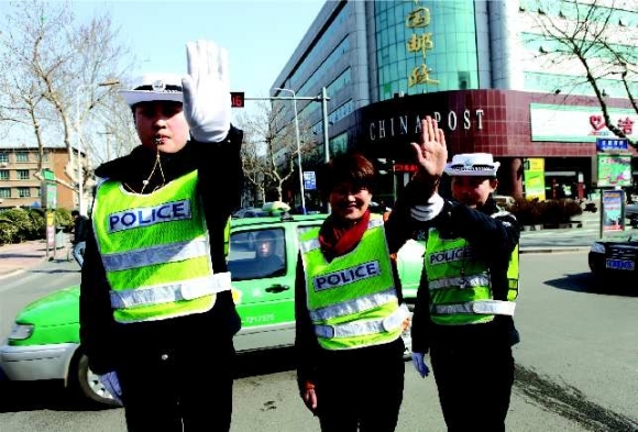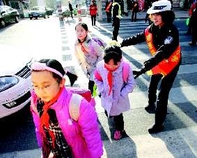 23日早7时,在烟台市南通路小学门前,年轻女教师身着警服,护送学生过马路。本报记者赵金阳 摄
