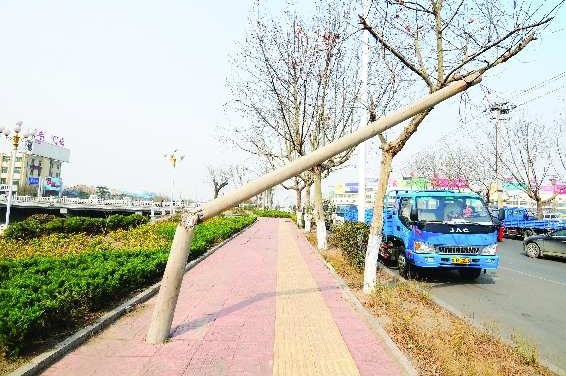 记者昨日在通达路和清河北路交会处东侧的人行道上,有一根“折腰”地线杆静静的靠在大树上。一司机告诉记者,这根线杆已经“折腰”1年多了,可一直无人认领。市民李健说,每次走到这里,他都要绕着走,生怕线杆倒下后被砸到,希望有关部门能尽快让线杆的腰杆重新挺起来。 记者 王璐 摄影报道