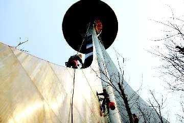 23日,在潍坊市北海路与北宫街路口的灯塔上,工作人员正在对灯塔进行全面清洗。据了解,灯塔外表钢板经过长时间的风吹日晒,已经失去了原有的光泽,并且有钢板出现松动,要进行保养。北海路灯塔建于1999年,高度约60米,是目前潍坊最高的灯塔。 本报记者 孙国祥 摄影报道