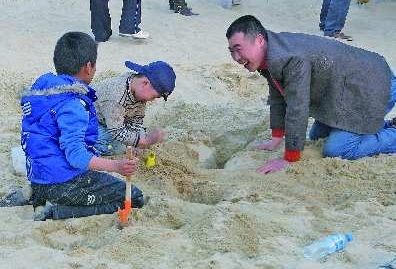在济南森林公园人造沙滩,一名男子和两个男孩挖沙“互动”,相视而笑,仿佛又回到挖沙逗乐的童年时代。