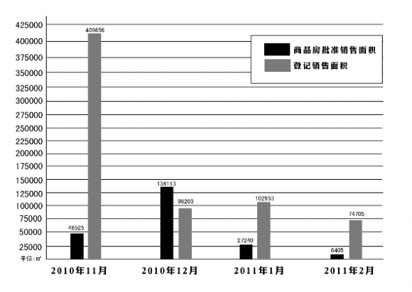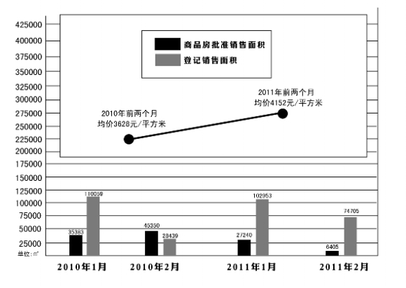 聊城市住建委提供的数据显示,2010年11月,城区商品房批准销售面积48525平方米,登记销售面积409656平方米,前11月均价3850元/平方米;2010年12月,城区商品房批准销售面积138113平方米,登记销售面积98203平方米,全年均价3757元/平方米;2011年1月,城区商品房批准销售面积27240平方米,登记销售面积102953平方米,均价3966元/平方米;2011年2月,城区商品房批准销售面积6405平方米,登记销售面积74705平方米,前两个月均价4152元/平方米。而去年同期,即2010年1月,城区商品房批准销售面积35383平方米,登记销售面积110059平方米,均价4050元/平方米;2010年2月,城区商品房批准销售面积45350平方米,登记销售面积28439平方米,前两月均价3628元/平方米。