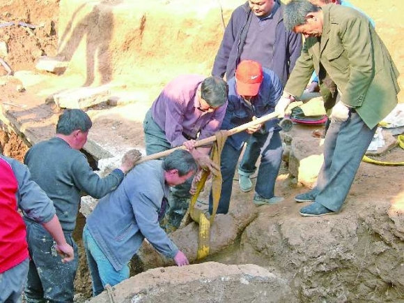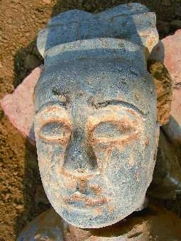 石俑的头部细节 3月25日,考古人员在济南槐荫区段店办事处后周王庄腊山河畔,发掘了一座迄今为止济南最大的北齐古墓,墓中葬有北齐王太妃,此次发掘出雕刻精美的石俑、陶罐、瓷碗、铁器等珍贵文物。其中,三个彩绘石俑是济南首次发现,在全省也较为少见。图为考古人员正抬起一个石俑。 本报记者 郭学军 摄