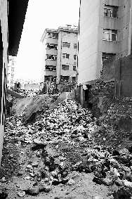 ▲垃圾通过这个缺口扔进鼓楼台小区。两个小区之间堆满了垃圾。 胡跃东 摄
