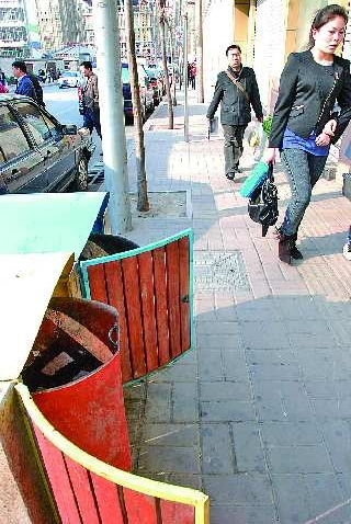 25日,山师东路上,人行道上的垃圾桶门敞开着,妨碍了市民通行。实习生 刘敏 摄