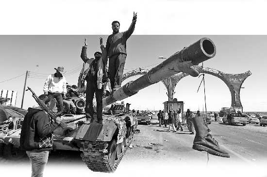 当地时间26日,人们站在损坏的坦克上庆祝反对派夺回重镇艾季达比耶。 东方IC供图