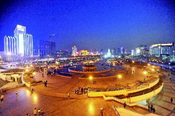 3月26日晚上8点半左右,在泉城广场,人们在景观灯关闭后的广场上嬉戏、玩耍(大图)。与熄灯前形成鲜明对比(小图)。